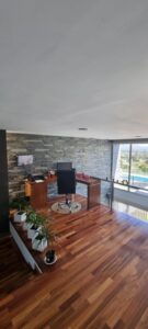 El nivel principal integra cocina, comedor y living con salida a una galería cubierta, asador y piscina sinfín con hidromasaje. Cada ambiente se orienta al paisaje, logrando una conexión natural entre interior y exterior.