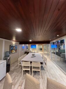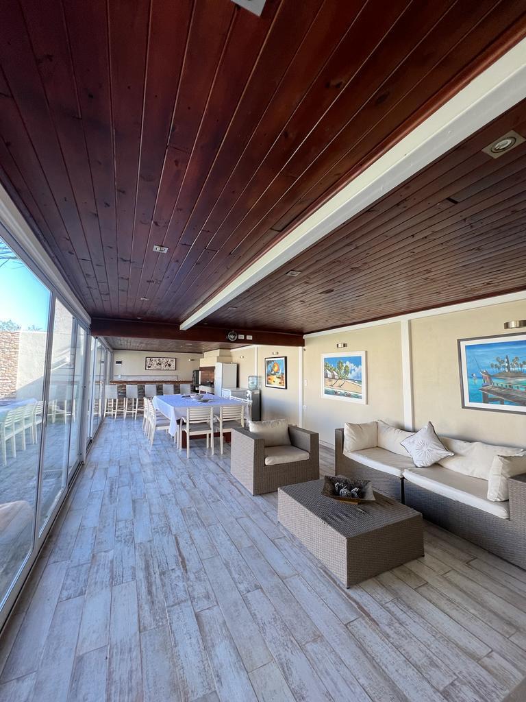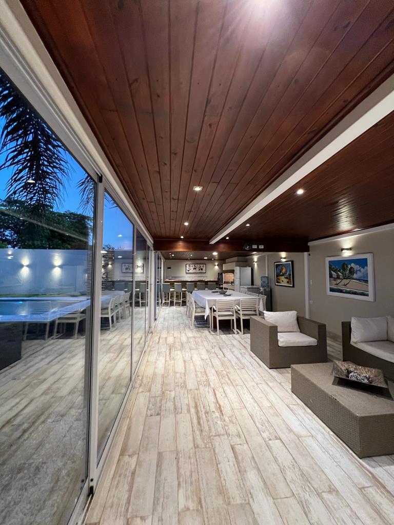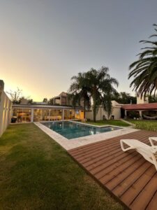 El área exterior integra una galería cerrada con aberturas de aluminio, barra y asador, que se conecta con la piscina revestida, deck con solárium y amplio parque. La cochera doble, con portón automatizado y espacio adicional para varios vehículos, completa la propuesta.